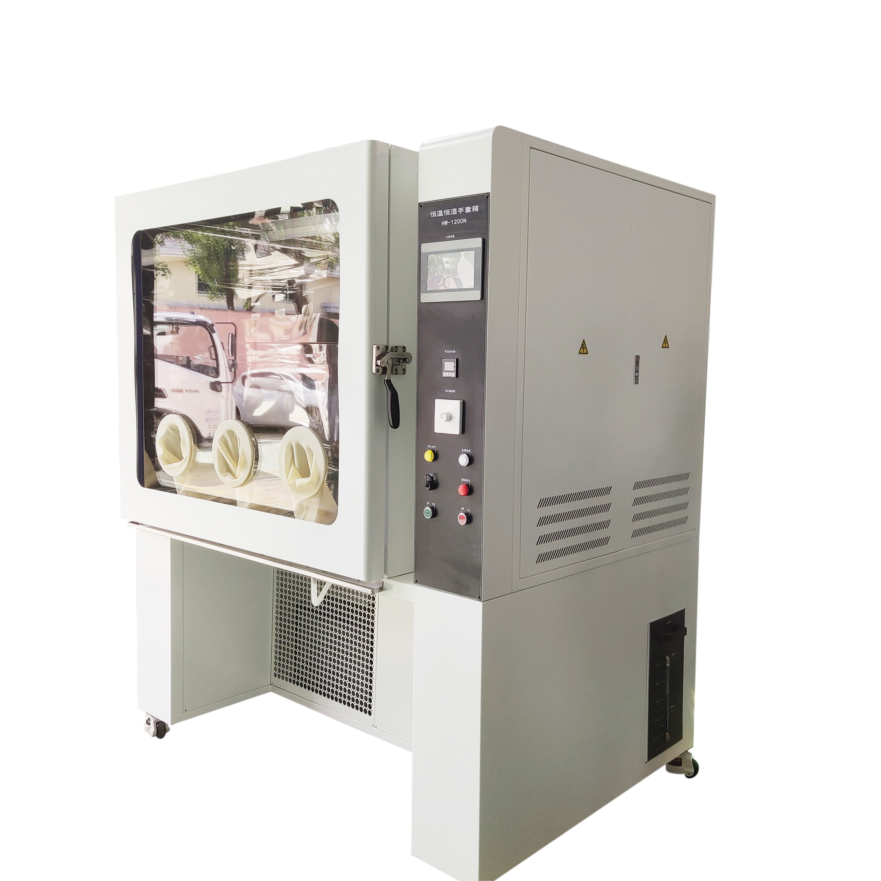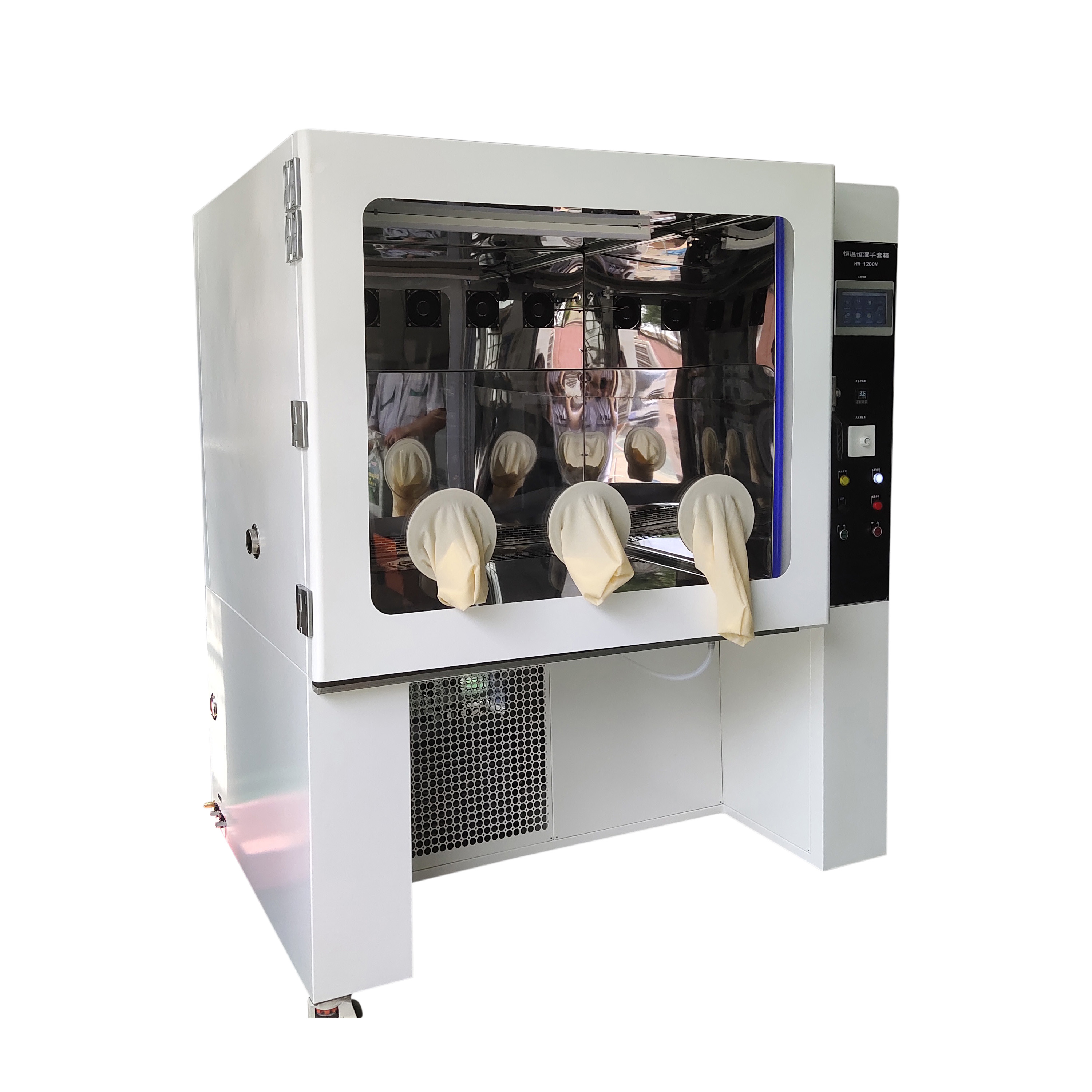 恒溫恒濕手套箱內(nèi)風速不影響樣品的存放,取拿等,恒溫恒濕采用上送風下吸風的循環(huán)方式,保證箱內(nèi)溫濕度均勻,箱門設置全框透明窗口,用以觀測室內(nèi)試樣的變化。觀察窗采用有機板,具有透明、隔熱、不易產(chǎn)生蒸汽結(jié)霜等優(yōu)點;并配置硅膠手套,人工操作過程中保證恒溫恒濕箱內(nèi)溫濕度波動。