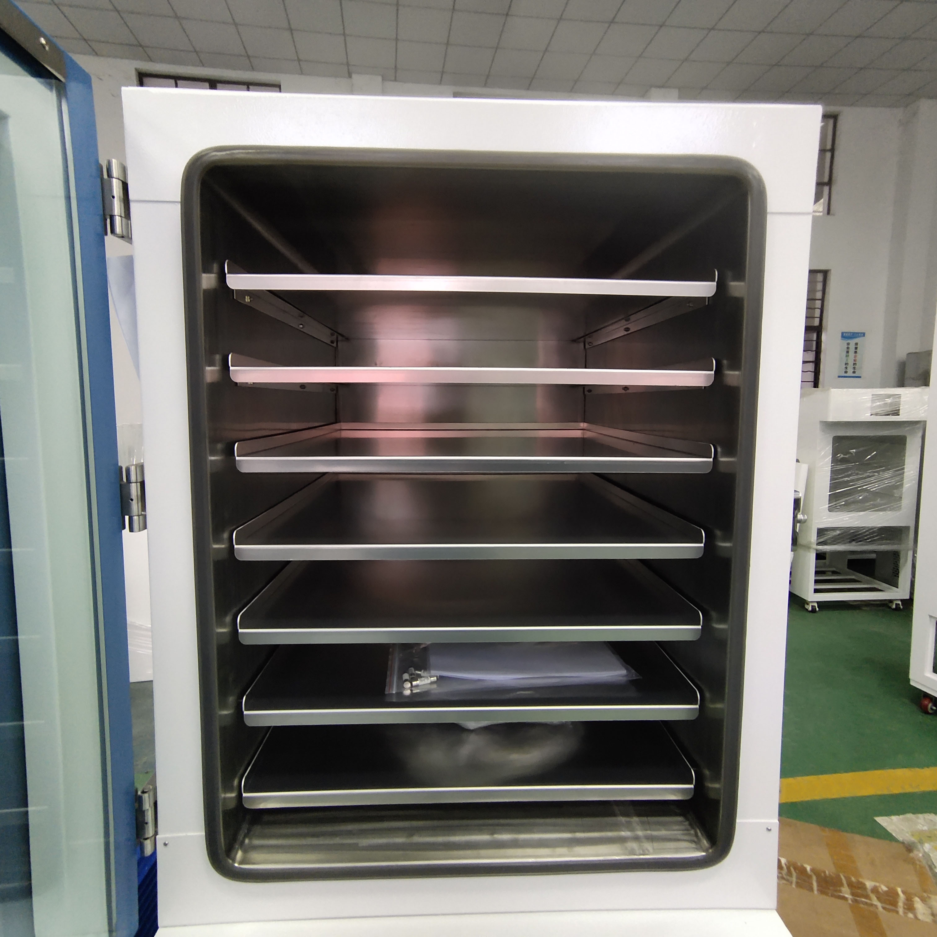 2. 工作室與玻璃門之間裝有一次性澆注成形耐高溫硅橡膠門封條有效密封,以保證箱內(nèi)達到較高的真空度。