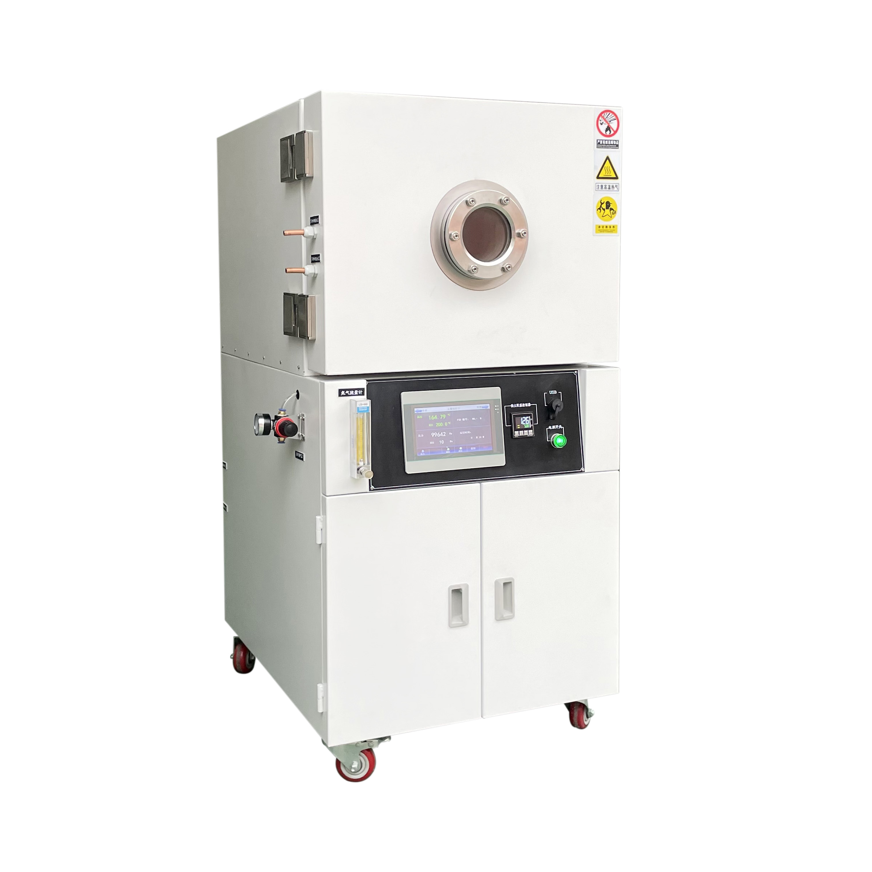 8. 立式結(jié)構(gòu),上部為腔體工作室,儀表中部,真空泵放在下部下箱柜,門上有圓形視窗