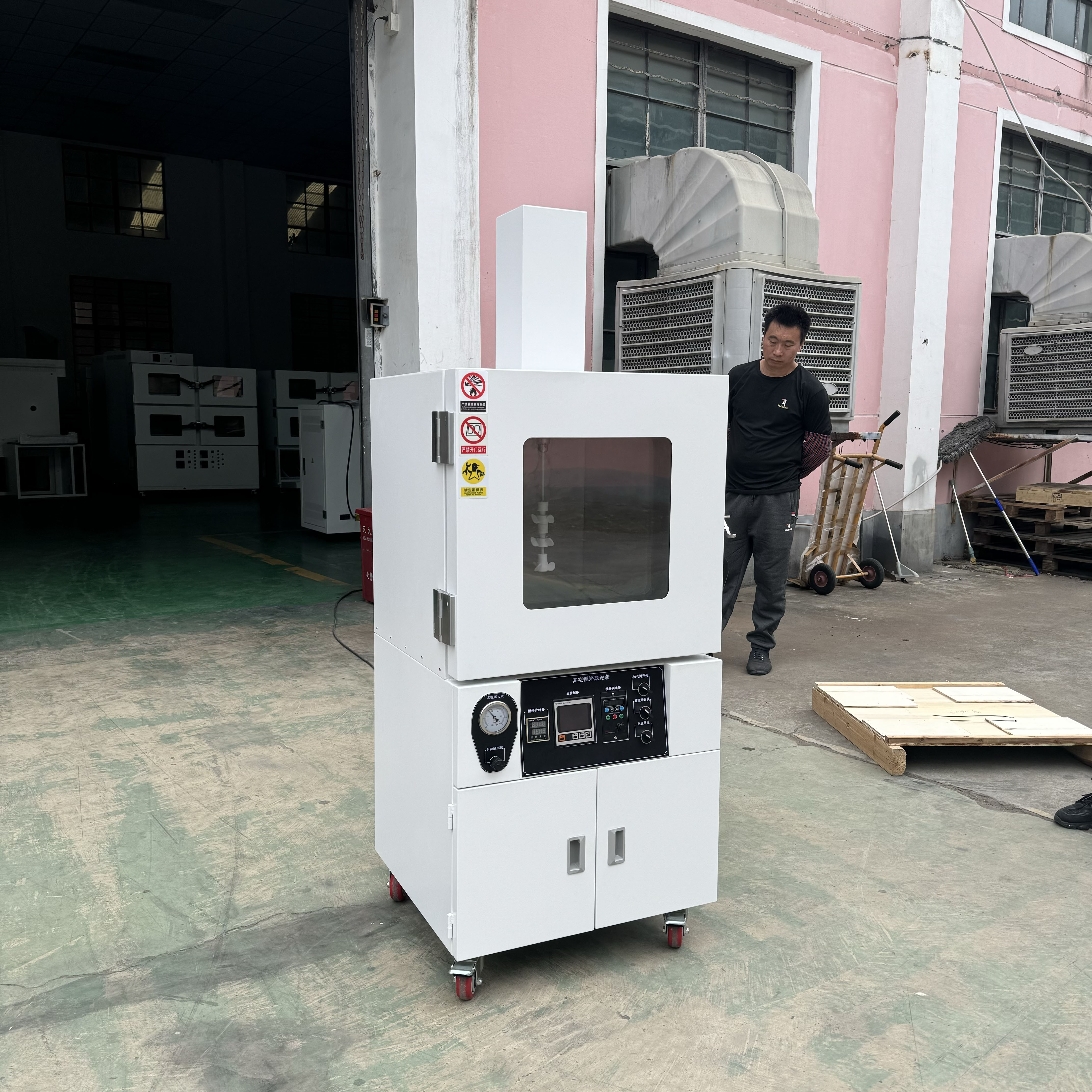 1.立式結(jié)構(gòu),腔體在上部,儀表在中部,真空泵在下部,底部移動腳輪