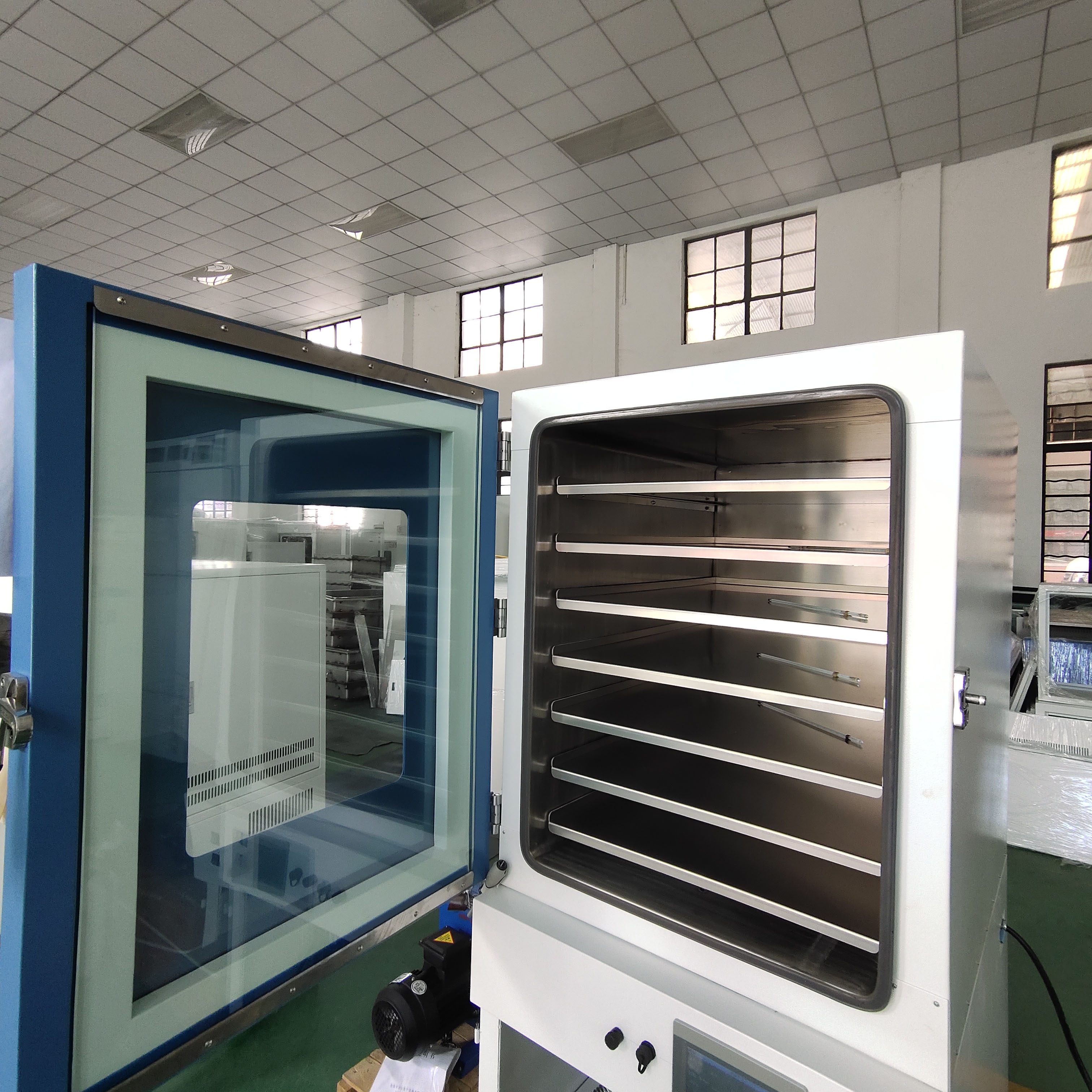 2. 工作室與玻璃門之間裝有一次性澆注成形耐高溫硅橡膠門封條有效密封,以保證箱內(nèi)達到較高的真空度。