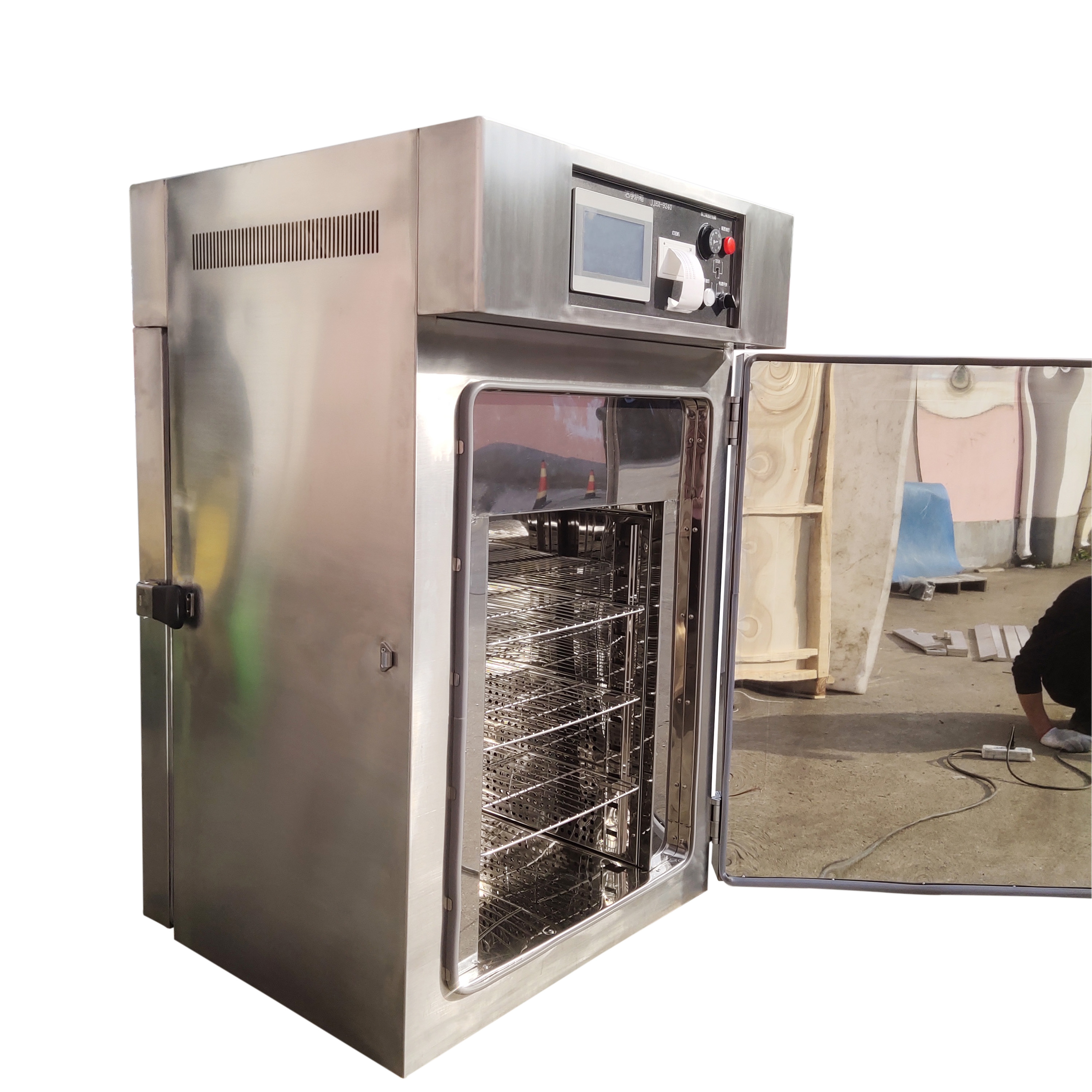 箱體基本結(jié)構(gòu) | 前后雙開門、電器控制界面置于上面、加熱循環(huán)置于側(cè)面,底部無移動腳輪 |