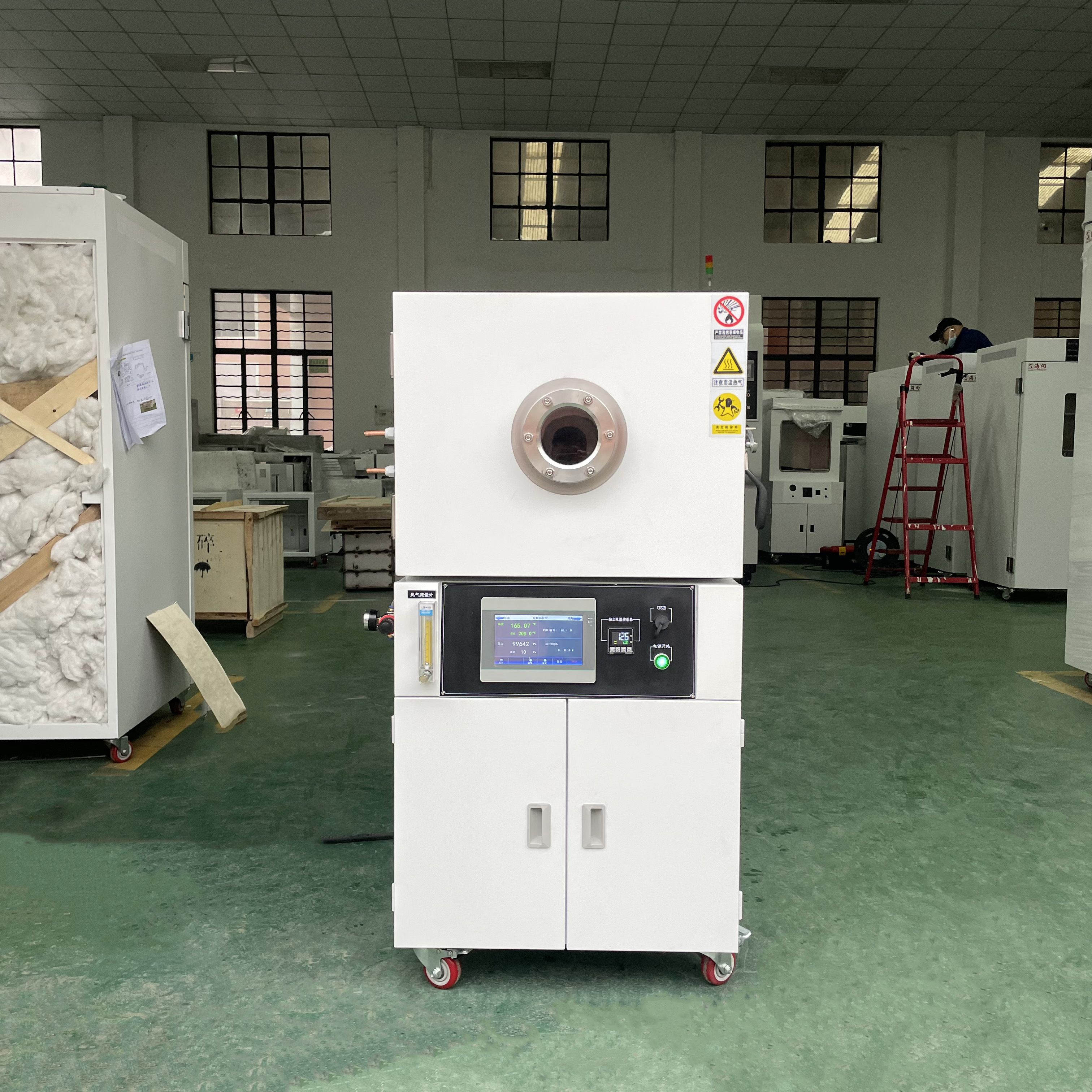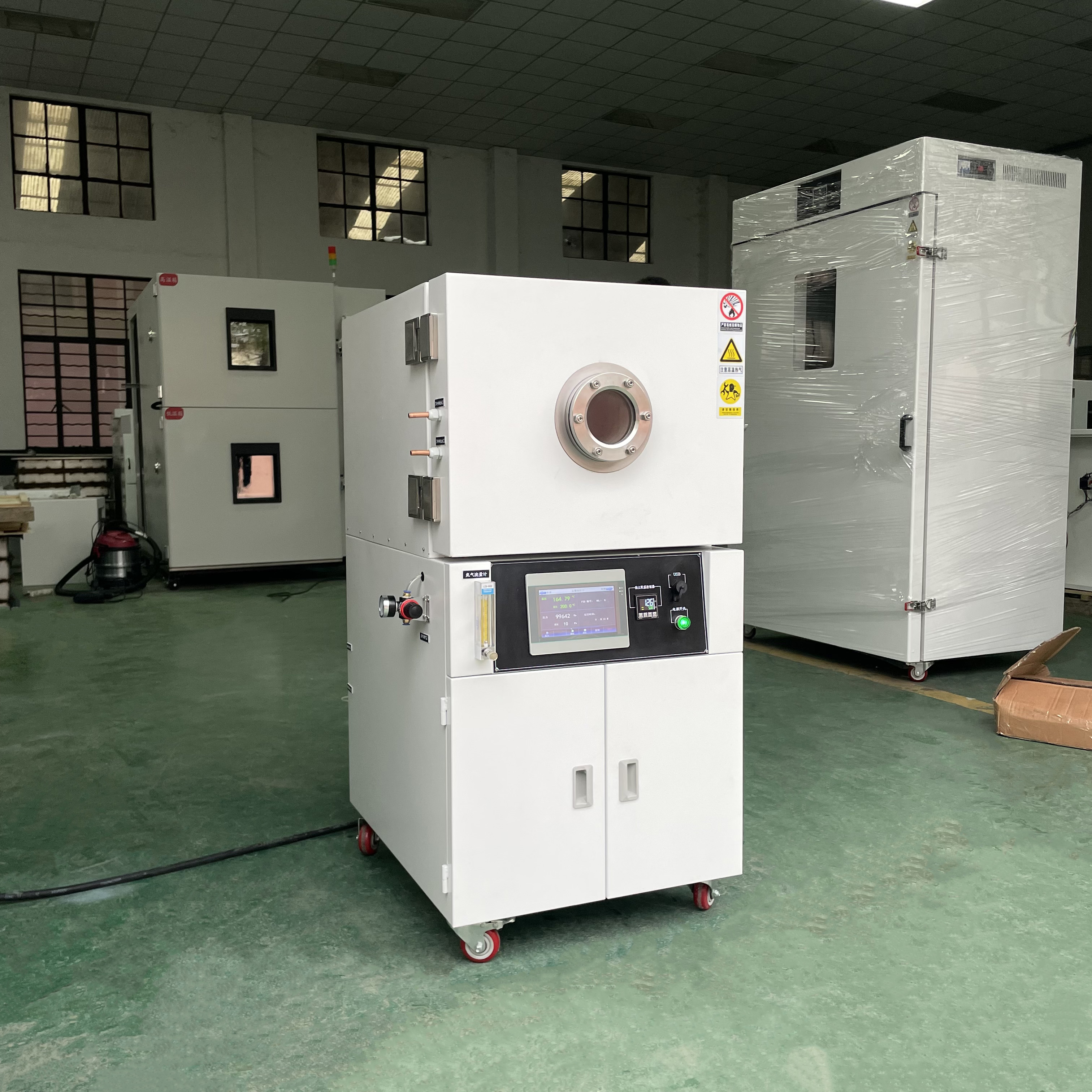 8. 立式結(jié)構(gòu),上部為腔體工作室,儀表中部,真空泵放在下部下箱柜,門上有圓形視窗