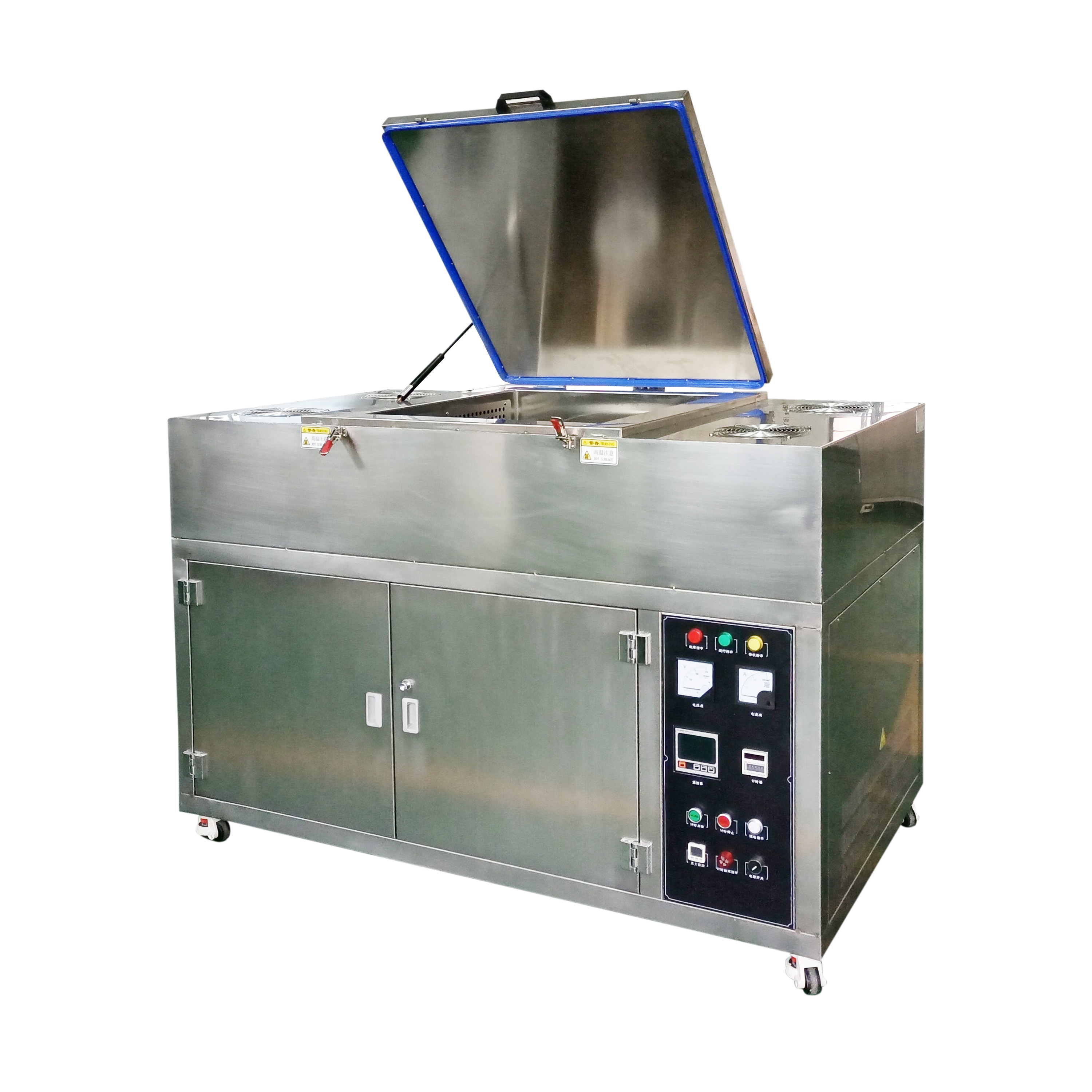 該設(shè)備由真空系統(tǒng),加熱系統(tǒng),電器控制系統(tǒng)、排水系統(tǒng)、風(fēng)道及箱門(mén)等組成